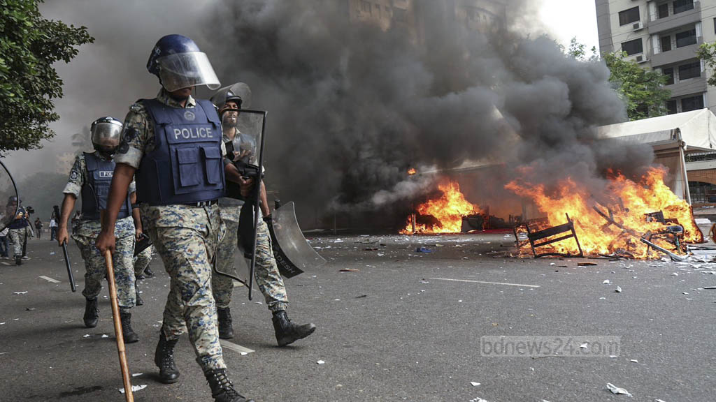 Later in the day, after being removed from the venue, the protesters regrouped on Manik Mia Avenue and clashed again with police. They reportedly vandalized a police bus and several vehicles, and set fire to tyres and wooden debris on the street. The confrontation, which lasted nearly two hours, subsided only after heavy rainfall in the afternoon.