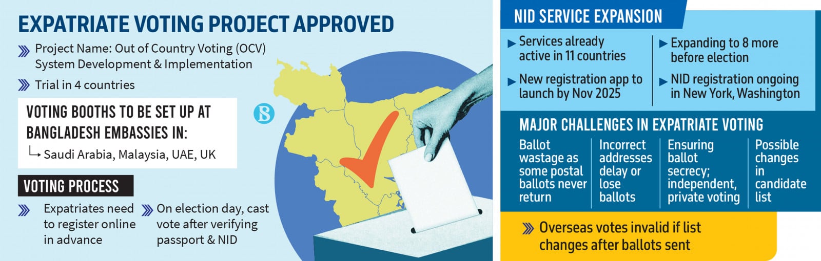 Under the EC’s plan, expatriate voting will first be piloted in Saudi Arabia, Malaysia, the UAE, and the UK, with voting booths set up at Bangladesh embassies. Voters will register online in advance and verify their passports and National ID cards on the day of voting.