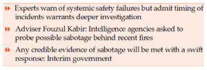 Energy Adviser Fouzul Kabir Khan, speaking to The New Nation on Saturday, acknowledged the speculation, saying, “Many have speculated that there are some powers behind the one-after-another fire incidents in Bangladesh as sabotage.