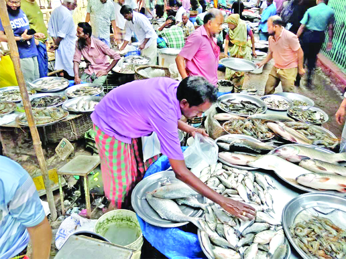 Customers throng a fish market in the city’s Kaptan Bazar on Friday, the weekly holiday. Though the supply of fish is ample, price remains high.