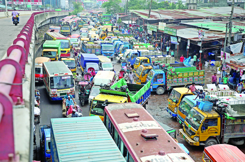 Vehicles of warehouse businessmen occupy three portion of the city’s Jatrabari area illegally. Such type of illicit occupation hampers traffic movement and eventually creates gridlock triggering sufferings to the commuters. The photo was taken on Thursday.