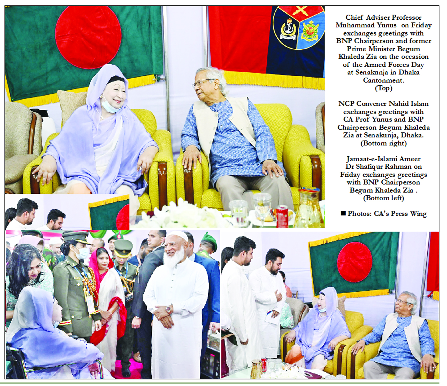 Chief Adviser Professor Muhammad Yunus on Friday exchanges greetings with BNP Chairperson and former Prime Minister Begum Khaleda Zia on the occasion of the Armed Forces Day at Senakunja in Dhaka Cantonment. (Top) NCP Convener Nahid Islam exchanges greetings with CA Prof Yunus and BNP Chairperson Begum Khaleda Zia at Senakunja, Dhaka. (Bottom right) Jamaat-e-Islami Ameer Dr Shafiqur Rahman on Friday exchanges greetings with BNP Chairperson Begum Khaleda Zia . (Bottom left)