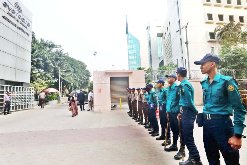 Police personnel are on vigil in front of Evercare Hospital in the city’s Bashundhara area on Tuesday as part of security which has been beefed up as BNP Chairperson Begum Khaleda Zia is undergoing treatment there.