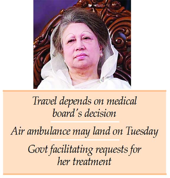 Several senior BNP leaders, however, indicated that an air ambulance could arrive in Dhaka on Tuesday if her condition improves, with the possibility of flying her to London the following day.