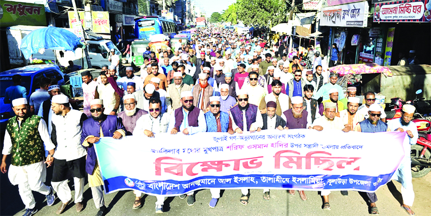 KULAURA, MOULVIBAZAR: A protest march was held in Kulaura upazila, against the shooting of Inqilab Mancha spokesperson Sharif Osman Hadi. The protest procession was organised by the Bangladesh Anjuman Al Islah and Talamiyah Islamia Kulaura Upazila and Municipal branches on Saturday.