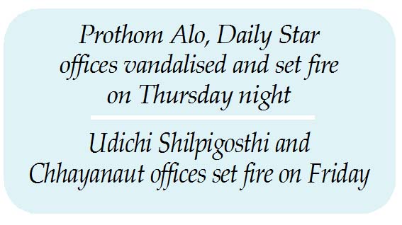 Later that night, groups of protesters attacked and set fire to the offices of the daily Prothom Alo and The Daily Star, forcing both newspapers to suspend their print and online operations.
