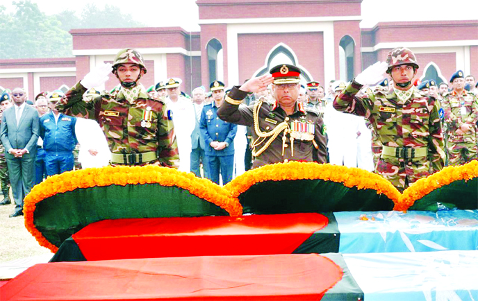 Chief of Army Staff General Waker-Uz-Zaman pays tribute to the coffins of six Bangladeshi peacekeepers