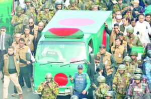 The vehicle wrapped in the national flag, carrying Khaleda Zia’s body, on way to Manik Mia Avenue for the funeral prayers of the former prime minister.