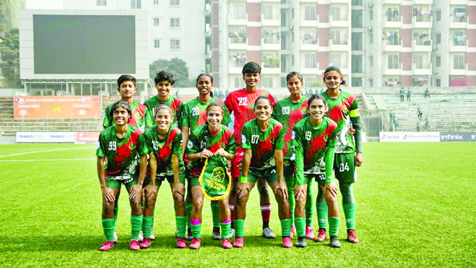 Players of Bangladesh Army Sports Club pose for a photo session before the match of Women’s Football League at Bir Shreshtha Shaheed Shipahi Mohammad Mostafa Kamal Stadium in the city’s Kamalapur on Saturday.
