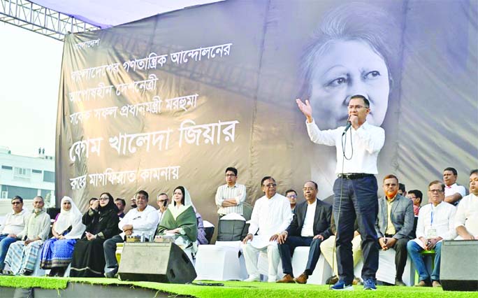 BNP Chairman Tarique Rahman speaks as chief guest at a doa mahfil held at the Mohakhali T&T Colony field on Tuesday, organised by Korail residents seeking forgiveness for the soul of former Prime Minister Begum Khaleda Zia.