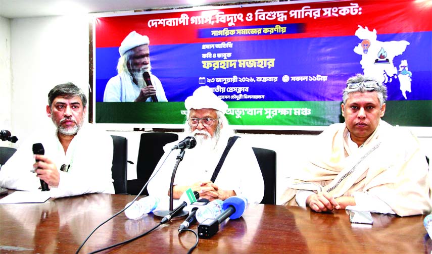 Human rights activist Farhad Mazhar delivers a keynote address at a discussion on the nationwide gas, electricity, and drinking water crisis, as well as the role of civil society, organised by Gono Abhuthan Suraksha Mancha at the National Press Club in the capital on Friday.