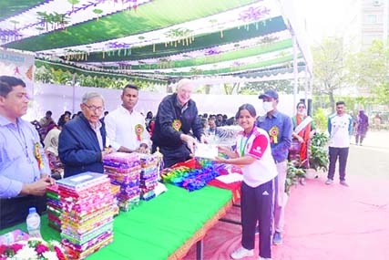 Vice-Chancellor of Notre Dame University Bangladesh (NDUB) Dr Father Patrick Daniel Gaffney, CSC hands over the prize to a winner of the Annual Sports Competition of NDUB at the campus of NDUB in the capital recently.