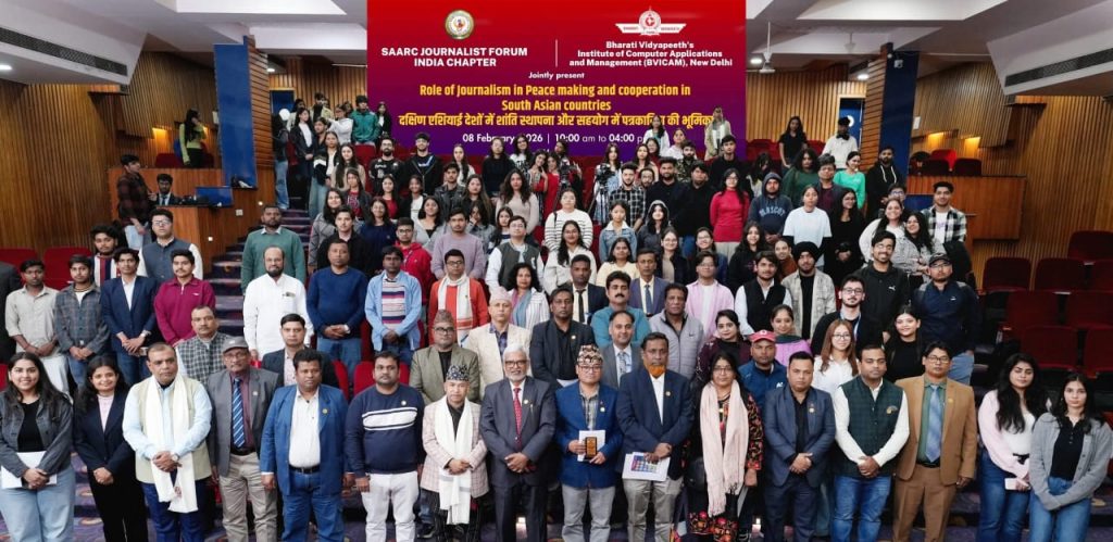 The conference, held yesterday on February 8 at the new Delhi campus of Bharati Vidyapeeth Educational Complex, had the theme: “Role of Journalism in Peace Making and Cooperation in South Asian Countries” (দক্ষিণ এশীয় দেশগুলোতে শান্তি রক্ষা ও সহযোগিতায় সাংবাদিকতার ভূমিকা).