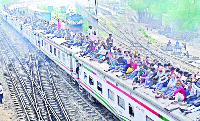 People are rushing to their villages on the roofs of trains, excited to cast their votes in the upcoming 13th parliamentary elections. This photo was taken from Kamalapur Railway Station on Tuesday.