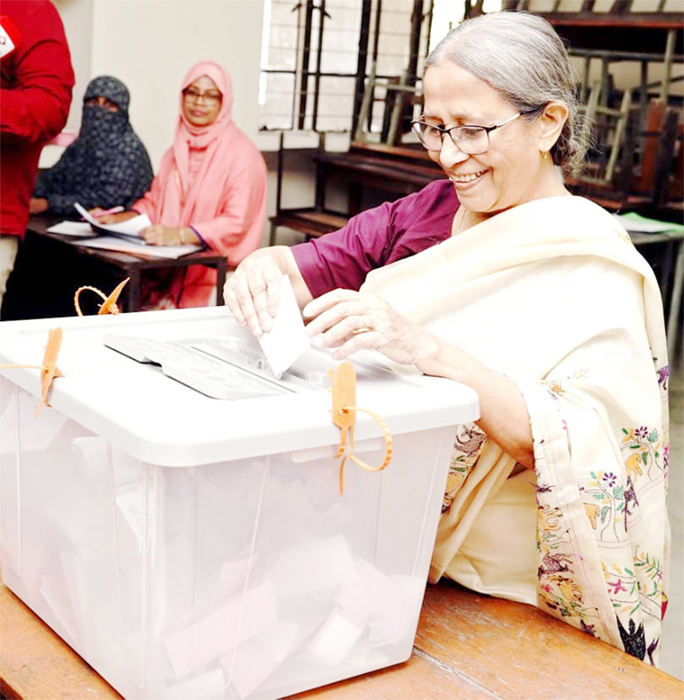 Fisheries and Livestock Adviser Farida Akhtar casted her ballot at Ananda School (Government Jamila Ainul Anand School and College) in Mohammadpur, Dhaka.