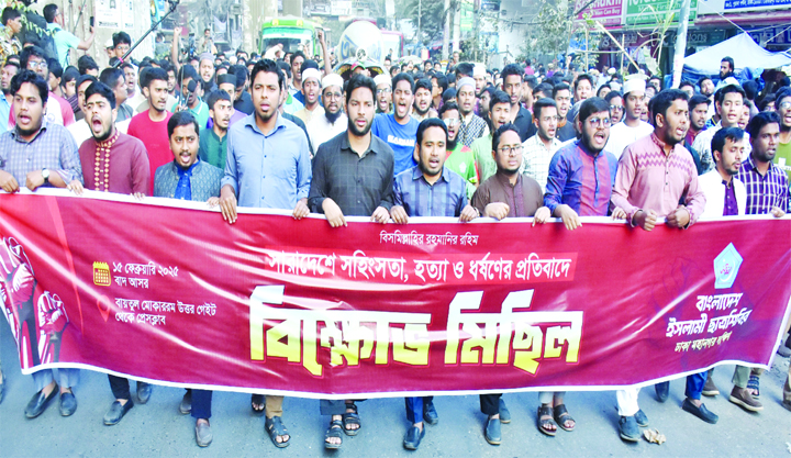 Bangladesh Islami Chhatra Shibir Dhaka metropolitan south brings out a protest rally from the north gate of the National Mosque Baitul Mokarram in the capital on Sunday protesting against violence, killing and rape across the country.