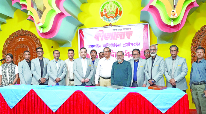 The officials and the writers of Kriralok pose for a photo session with the chief guest Editor of the Kriralok and Managing Editor of The New Nation Arshad Hosein at the Hotel Imperial International in the capital on Wednesday.