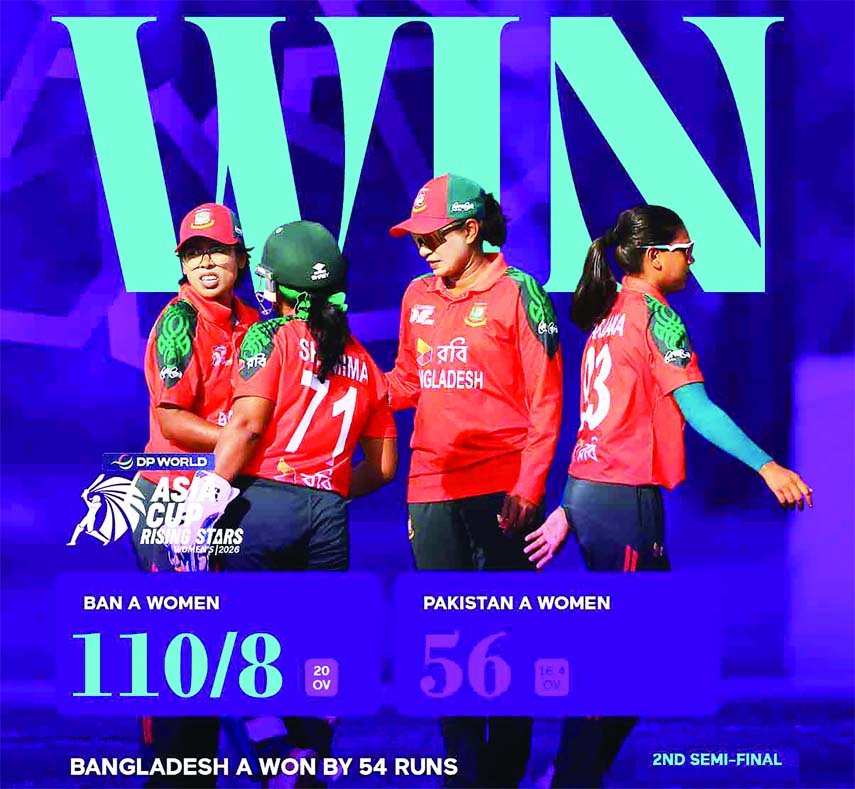 Bangladesh ‘A’ Women’s Cricket team stormed into the final of the Asian Cricket Council (ACC) Women’s Asia Cup Rising Stars defeating Pakistan ‘A’ Women’s Cricket team by 54 runs in the second semi-final at Terdthai Cricket Ground in Bangkok on Friday.