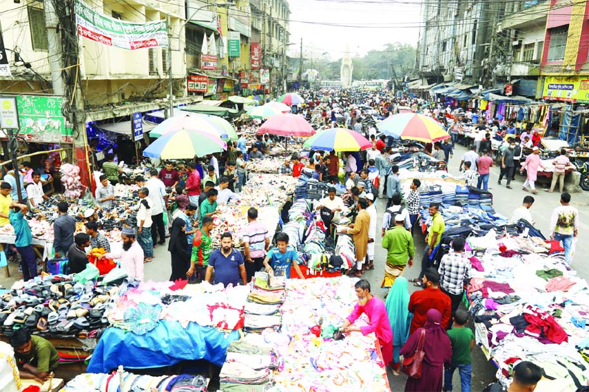 City’s Eid markets are starting to fill up and various types of products available there. This photo was taken from the Gulistan area in the capital on Tuesday.