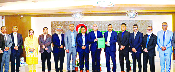 Yasir Azman, chief executive officer of Grameenphone Limited, and Ahsan Zaman Chowdhury, managing director and CEO of Trust Bank PLC, pose for a photograph after signing the agreement at the bank’s head office in Dhaka recently.