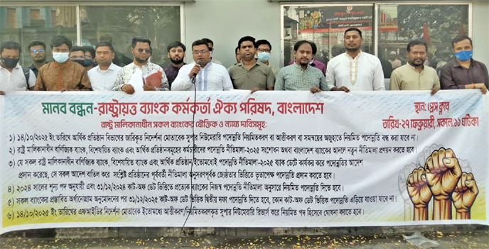 Members of the Bangladesh State Bank Employees’ Council formed a human chain in front of the National Press Club on Friday, pressing for their six-point charter of demands.