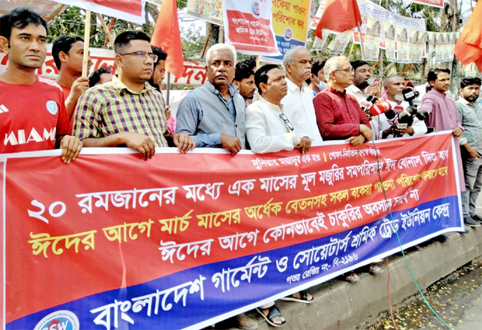 The Bangladesh Garment and Sweaters Workers’ Trade Union Centre staged a human chain outside the National Press Club on Friday, demanding payment of half a month’s salary along with all outstanding dues before Eid-ul-Fitr.