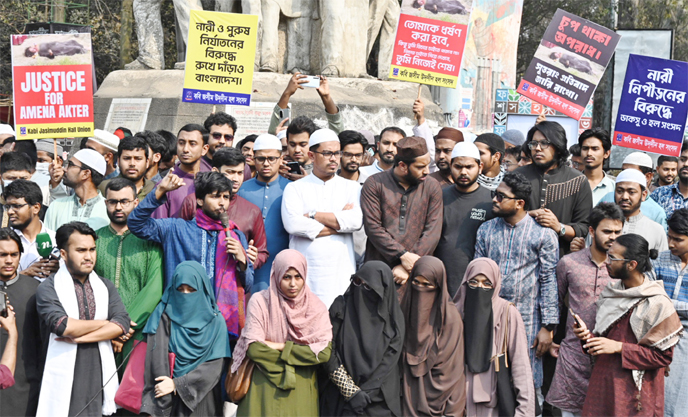The Dhaka University Central Students’ Union (DUCSU) staged a protest Friday in front of the Raju Sculpture at Dhaka University, demanding exemplary punishment for perpetrators of rape and violence incidents across the country, including Narsingdi.