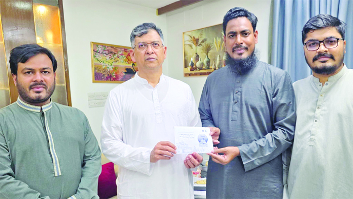 Akhtar Hossain, member secretary of National Citizen Party (NCP), hands over an invitation card for an iftar reception marking the party’s first founding anniversary to Home Minister and BNP standing committee member Salahuddin Ahmed.