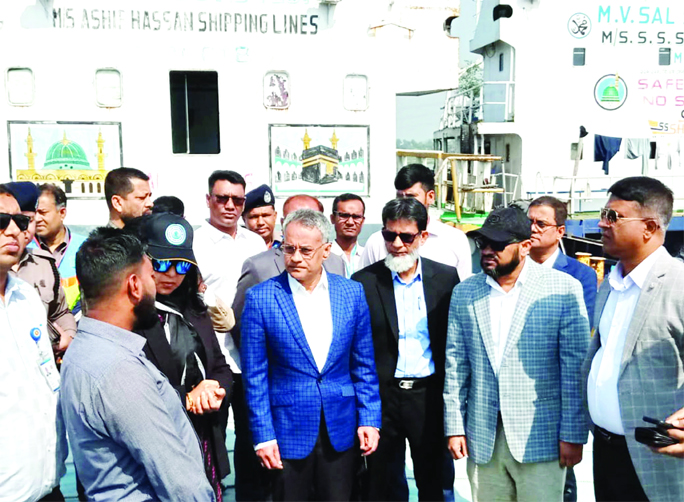 Shipping Minister Sheikh Rabiul Alam visits the Dhaleshwari River area in Munshiganj district on Saturday. State Minister of Road Transport and Bridges Habibur Rashid was present there on the occasion.