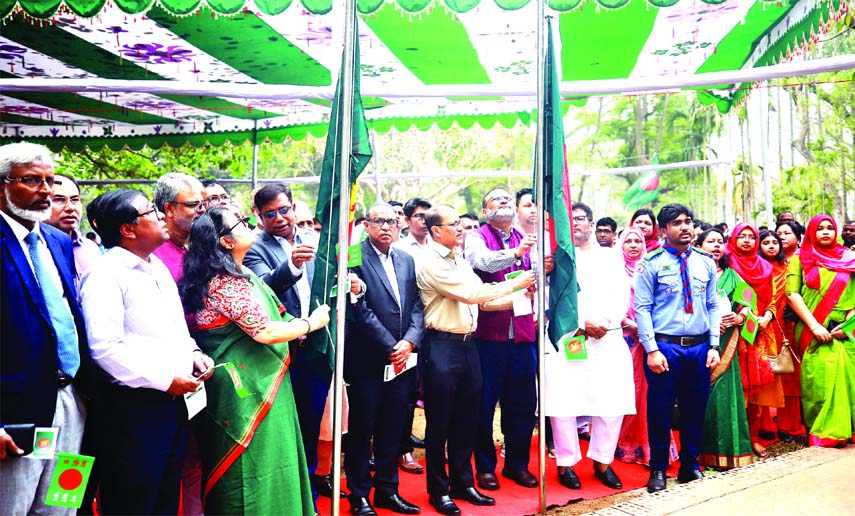 Dhaka University teachers and students observed Historic National Flag Hoisting Day at Bottola adjacent to Kala Bhaban on the campus on Monday. DU Vice-Chancellor Prof. Dr. Niaz Ahmad Khan was present.