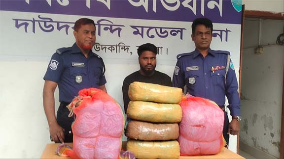 DAUDKANDI, CUMILLA: Police apprehends a man with 18 kilograms of cannabis being seized a private car at a checkpoint on the Dhaka-Chattogram Highway toll plaza in the upazila on Monday.