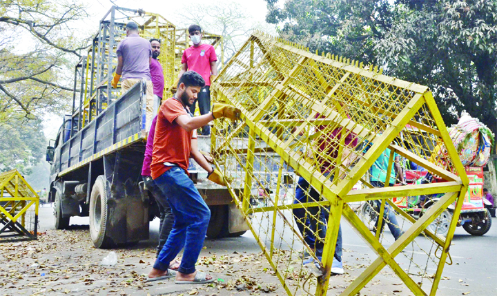 Barricades placed for February 21 securities near the Central Shaheed Minar are taken down on DMP’s orders.