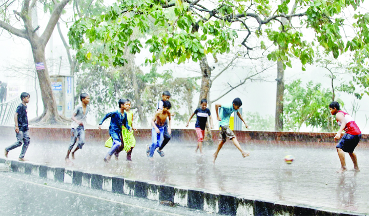 Children and teens are seen playing football in the season’s first rain in mid-Falgun at the city’s Hatirjheel area. The photo was taken on Monday.