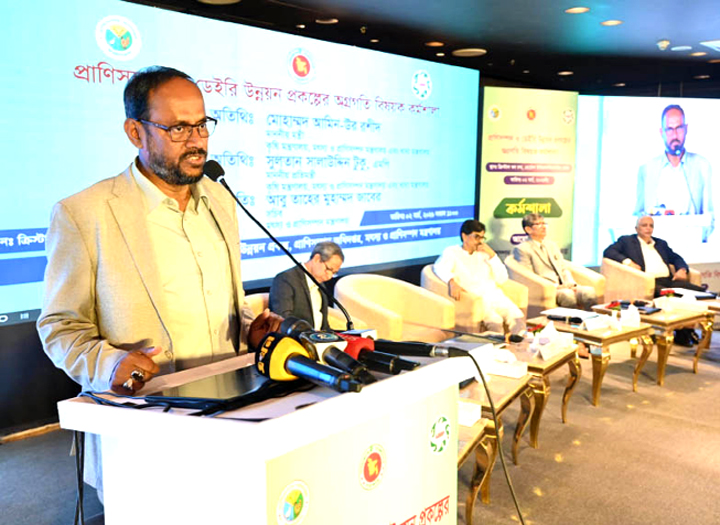 State Minister for Food, Fisheries and Livestock and Agriculture Sultan Salahuddin Tuku speaks as special guest at a workshop on livestock and the headway of dairy development project held at Hotel Intercontinental in the capital on Monday. Minister Mohammad Amin Ur Rashid was present on the occasion.