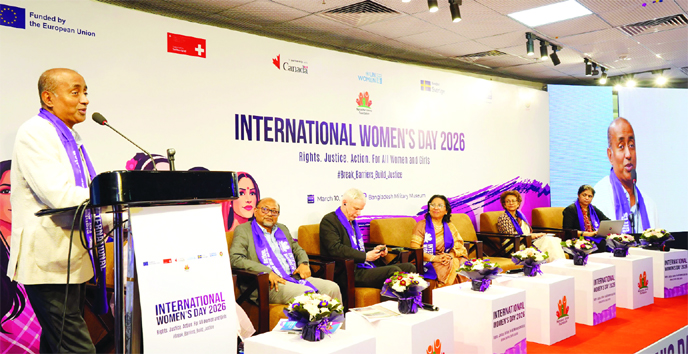 Law, Justice and Parliamentary Affairs Minister MdAsaduzzaman delivers speech as chief guest at a seminar titled on ‘Rights, Justice, Action for All Women and Girls’ organised at Bangladesh Military Museum in the capital to mark International Women’s Day 2026 on Tuesday.