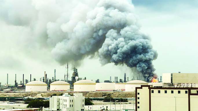 Smoke rises following a strike on the Bapco Oil Refinery, amid the U.S.-Israeli conflict with Iran, Sitra Island, Bahrain, March 9, 2026.
