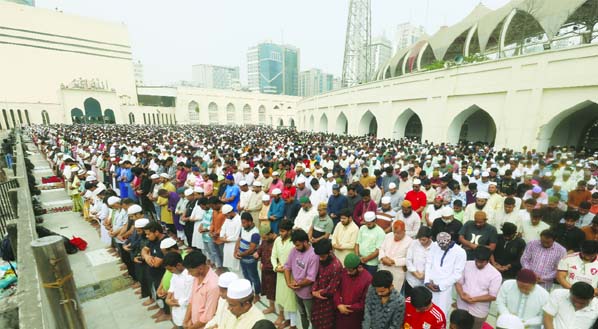 Muslims offer Jumatul Bida prayers on the last Friday of the holy month of Ramadan 2026 at the National Mosque Baitul Mukarram.