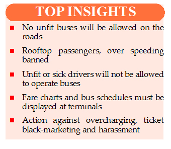 Carrying passengers on bus rooftops, overspeeding and allowing sick or unfit drivers to operate vehicles will also be strictly prohibited, he said.