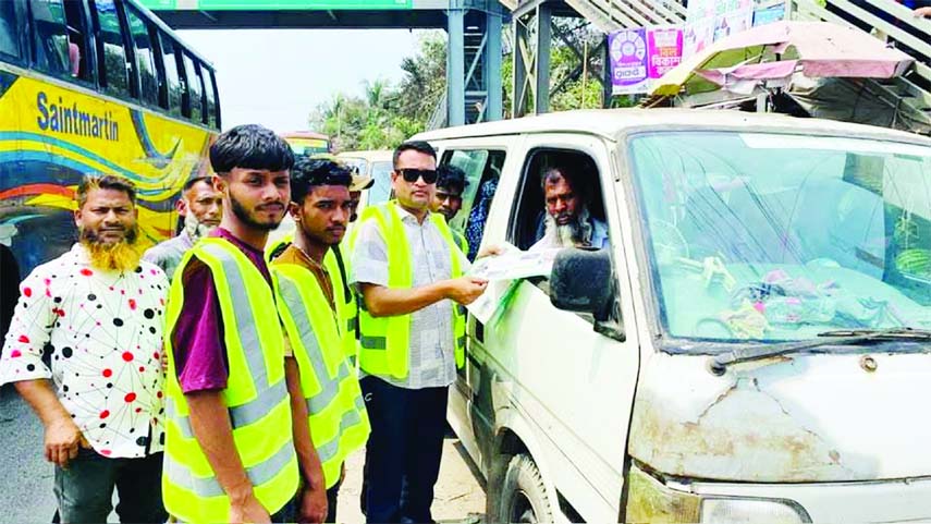 DAUDKANDI: Volunteers of Nirapad Sarak Chai's Daudkandi unit distribute road safety awareness leaflets among drivers, passengers and pedestrians on the Dhaka-Chattogram Highway at Gouripur bus stand in Cumilla on Sunday to promote safe Eid travel.