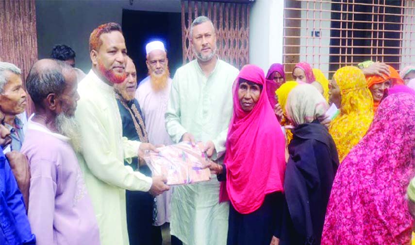 GANGACHARA (RANGPUR): BNP leader Nazim Uddin Pramanik Liju distributes sarees and lungis among needy people at his residence in New Star Para of Gangachara, Rangpur, on Sunday ahead of Eid-ul-Fitr.