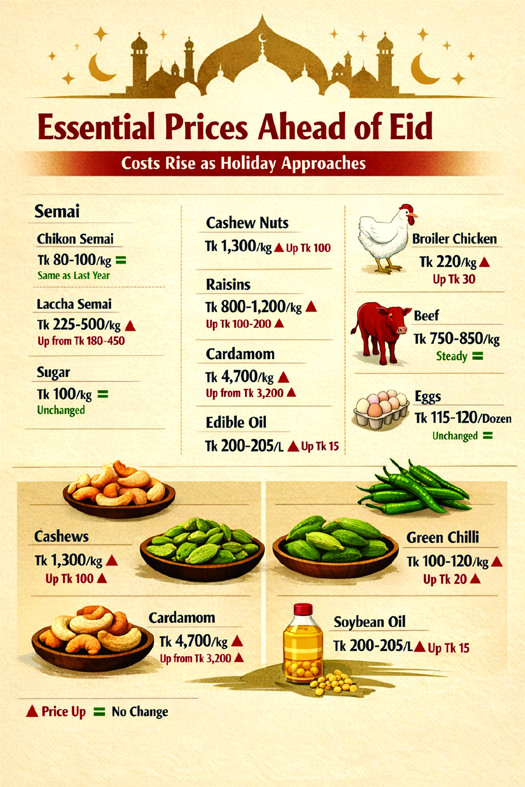 Demand for nuts and spices has also risen sharply. Sugar is selling at Tk 100 per kilogram, while milk powder ranges from Tk 350 to Tk 480 per half kilogram depending on brand. Cashew nuts are priced at Tk 1,300 per kilogram, up Tk 100 from last year, while raisins range from Tk 800 to Tk 1,200 per kilogram. Spice prices have climbed, with cardamom rising to Tk 4,700 per kilogram from Tk 3,200 six months ago.