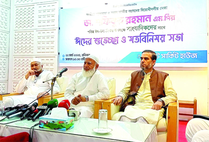 SYLHET: Jamaat Ameer and Opposition Leader Dr Shafiqur Rahman exchanges Eid greetings with journalists at the Circuit House in Sylhet on Sunday.