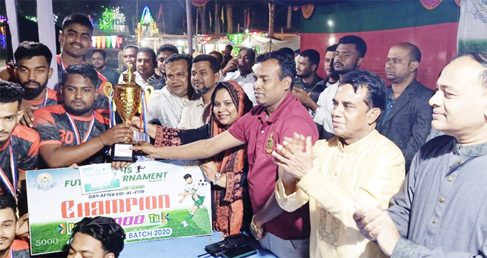 MADHUKHALI (FARIDPUR): Upazila Nirbahi Officer Raoshna Jahan hands over the awards to the winners after the final of the 16-team futsal tournament at Madhukhali Pilot High School on Monday.