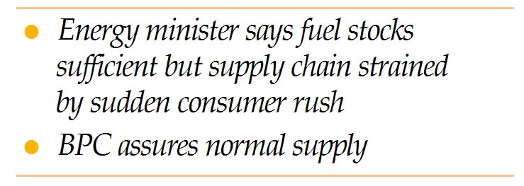 The minister attributed the situation to distribution delays rather than any actual shortage, noting that transporting fuel from depots to petrol pumps takes time.