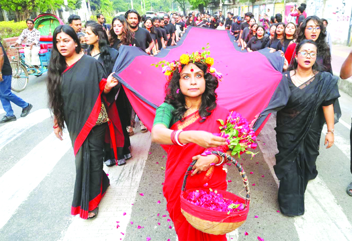 Cultural activists hold a mourning rally in front of Shaheed Minar in the capital on Wednesday on the occassion of Genocide Day.