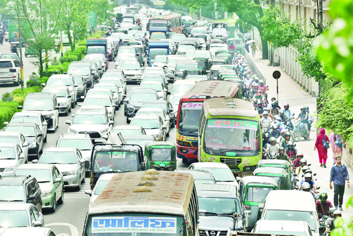 As working people return to Dhaka after the long Eid holiday, traffic pressure on the main roads gradually increases, and the city regains its familiar face. The photo was taken from the capital’s old airport area at Bijoy Sarani on Tuesday.