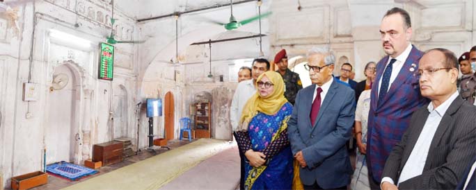 US Ambassador to Dhaka Brent T Christensen and Cultural Affairs Minister Nitai Roy Chowdhury visit the historic Mughal-era Musa Khan Mosque at Dhaka University on Tuesday.
