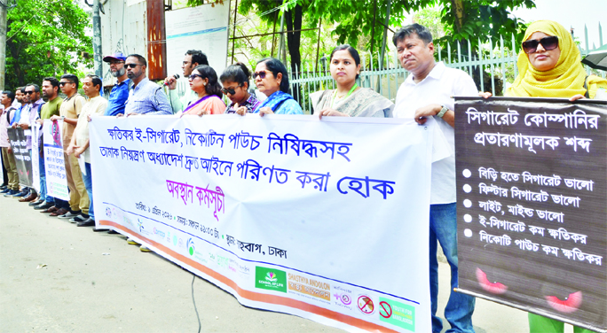 Various anti-drug organisations form a human chain in front of the National Museum in the capital on Wednesday, demanding a ban on harmful e-cigarettes and nicotine pouches, as well as the speedy enactment of the Tobacco Control Ordinance into law.