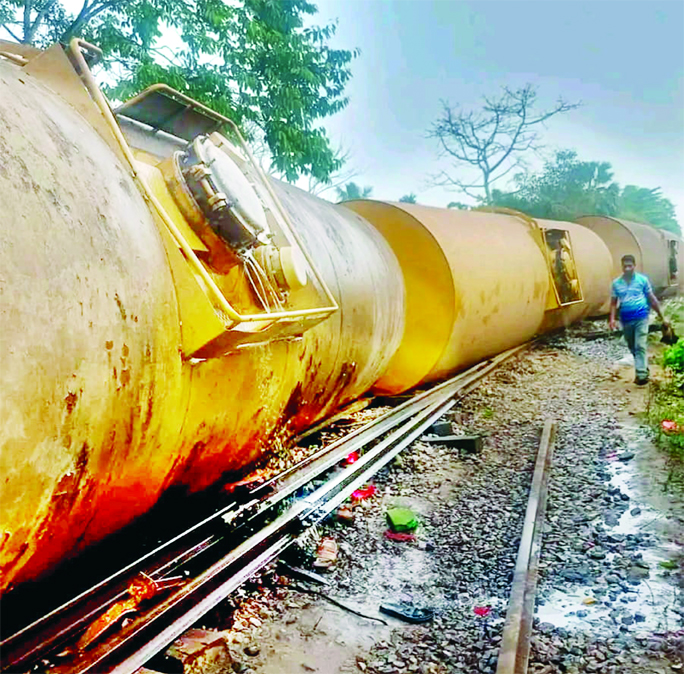 An oil train bound for Sylhet derails on Wednesday night, six coaches fall off the railway line at the Noapara area of Madhabpur, Habiganj. A large amount of fuel oil spills onto nearby roads, agricultural land and canals.