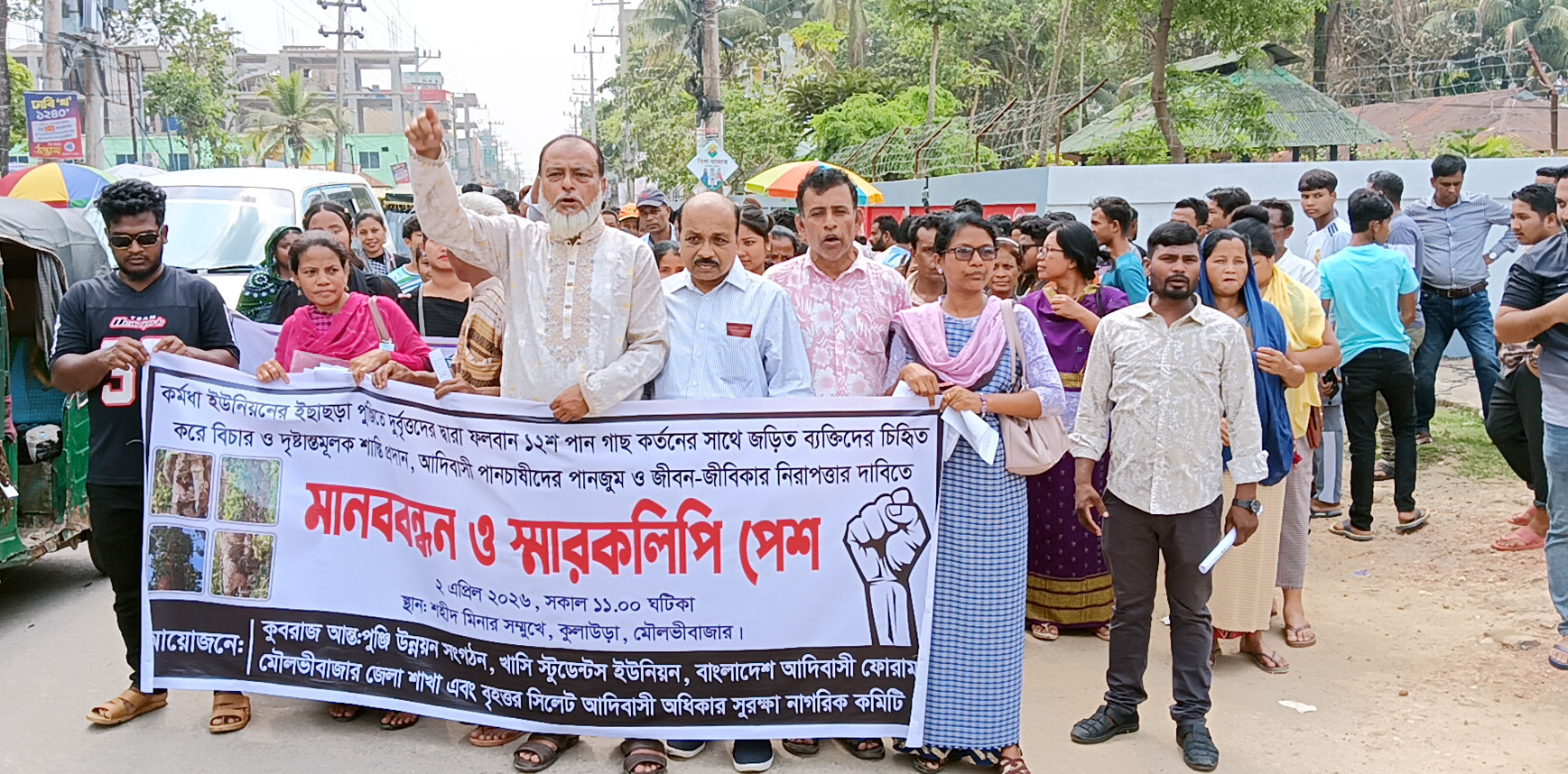To press their demands for the security of life and livelihood, Kubraj Inter-Capital Development Organization, Khasi Students Union, Bangladesh Adivasi Forum (Moulvibazar district branch), and Greater Sylhet Adivasi Rights Protection Citizens Committee formed a large human chain in Kulaura municipality on Thursday afternoon.